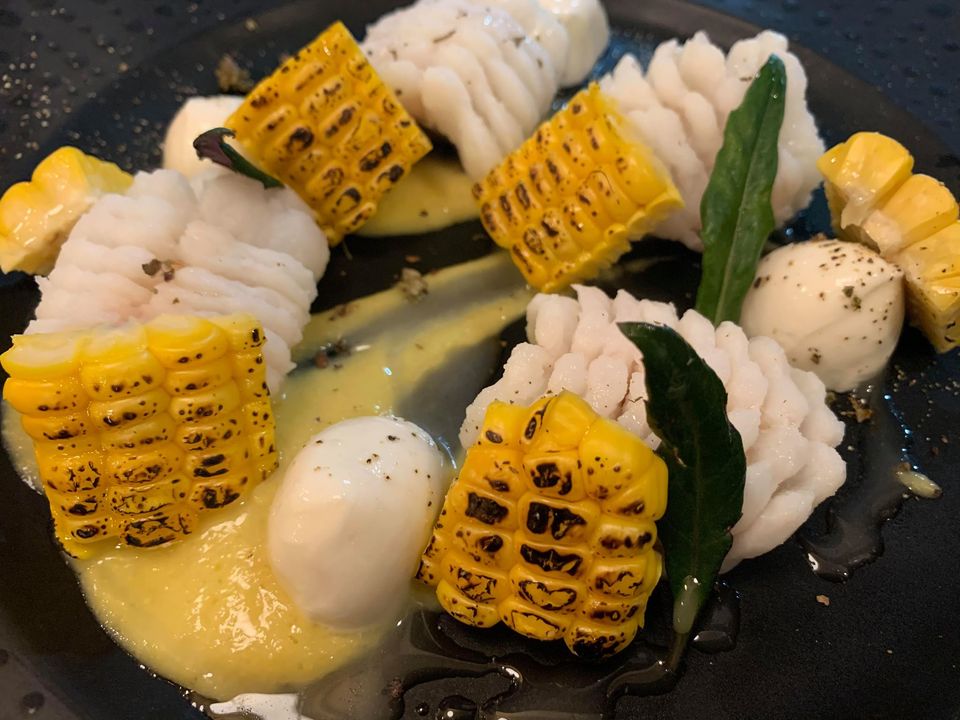 『鱧と焼きトウモロコシ モッツァレッラチーズ トウモロコシのソース』